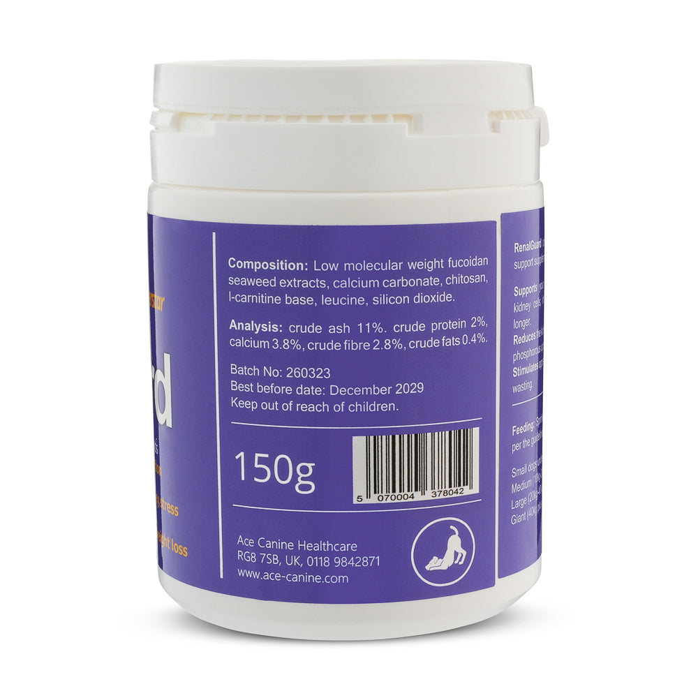 The RenalGuard pot is 150g and contains over 100 level scoopfuls. The pot will last a small dog nearly 4 months and an average sized dog (20kg) 2 months